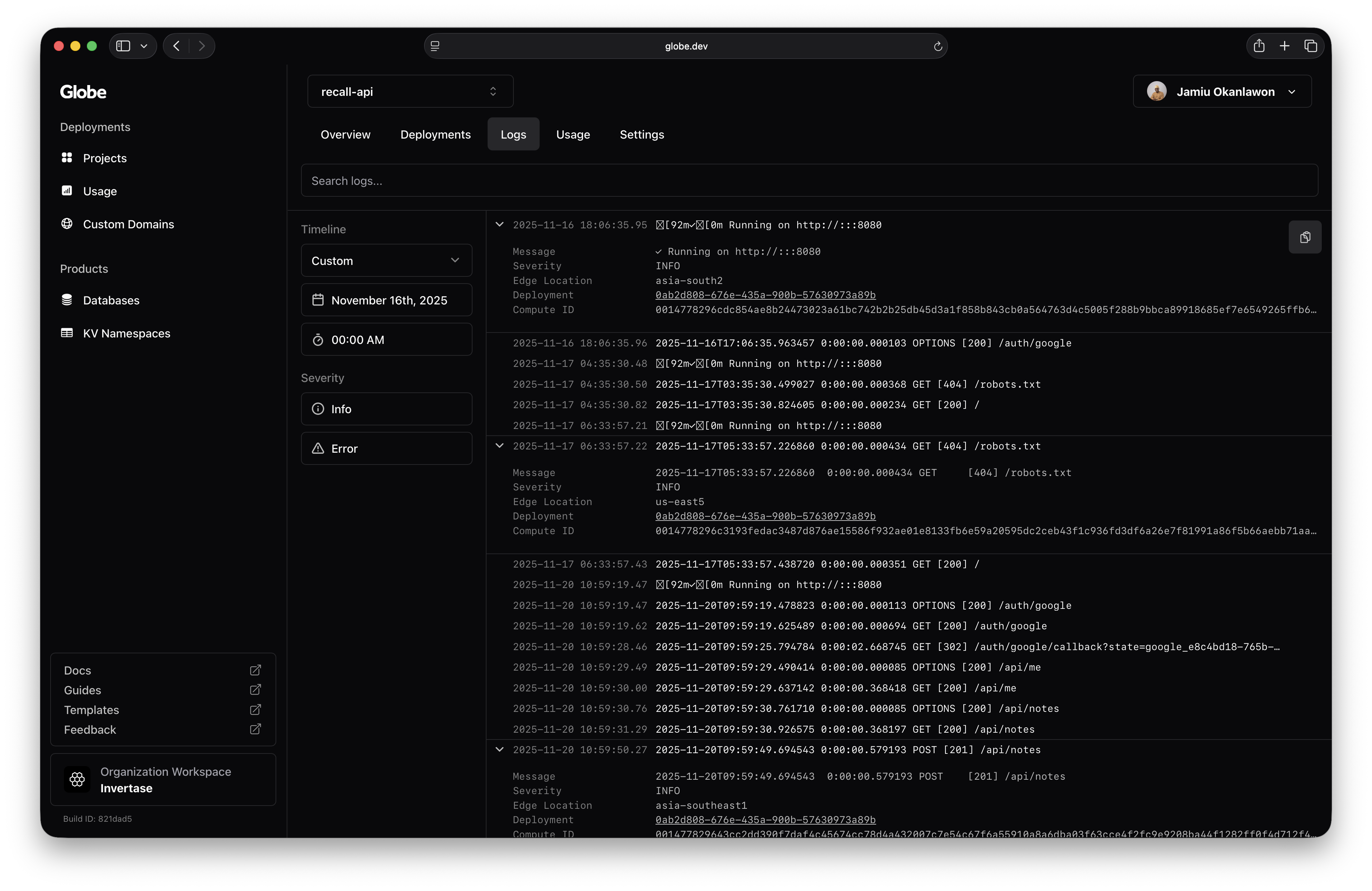 Monitor runtime logs for your Globe deployments to debug errors, track application behavior, and validate configuration changes.