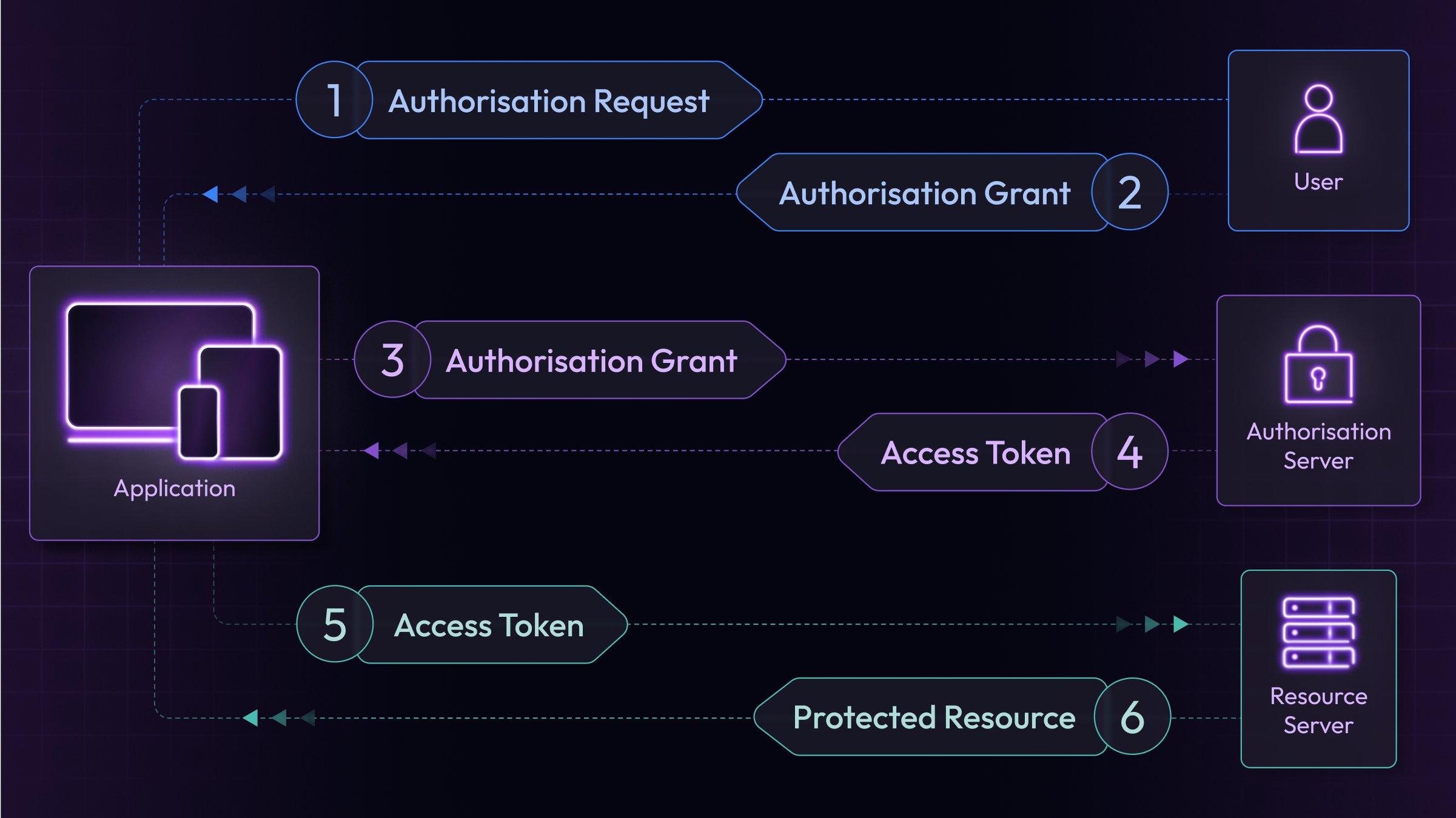 The OAuth flow involves four key participants. Let's imagine "MyCoolApp" wants to see your Google Contacts.